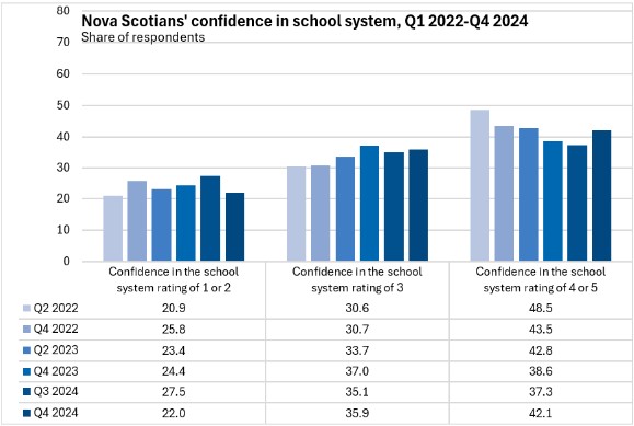 The portion of Nova Scotians with the highest levels of confidence in the school system has been falling, but this partially reversed in Q4 2024.
