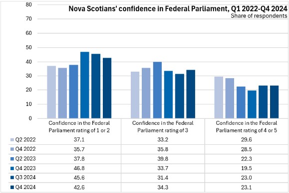 The portion of Nova Scotians indicating lower levels of confidence in the Federal Parliament increased in the last quarter of 2023. Nova Scotians' confidence in Federal Parliament improved later in 2024.
