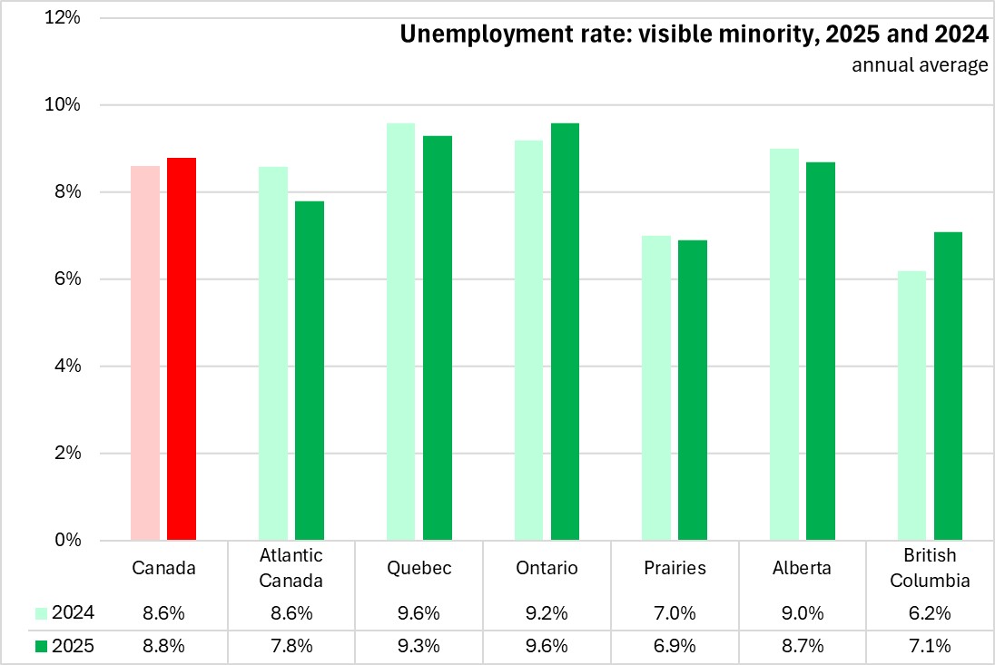 Unemployment rates for visible minority populations increased to 8.8% in Canada from 8.6% in 2024. Increases in unemployment rate in Ontario and British Columbia offset the declines in other regions. The largest decline in the visible minority unemployment rate in was in Atlantic Canada (-0.8 percentage points) and the largest increase was in British Columbia (+0.9 percentage points).