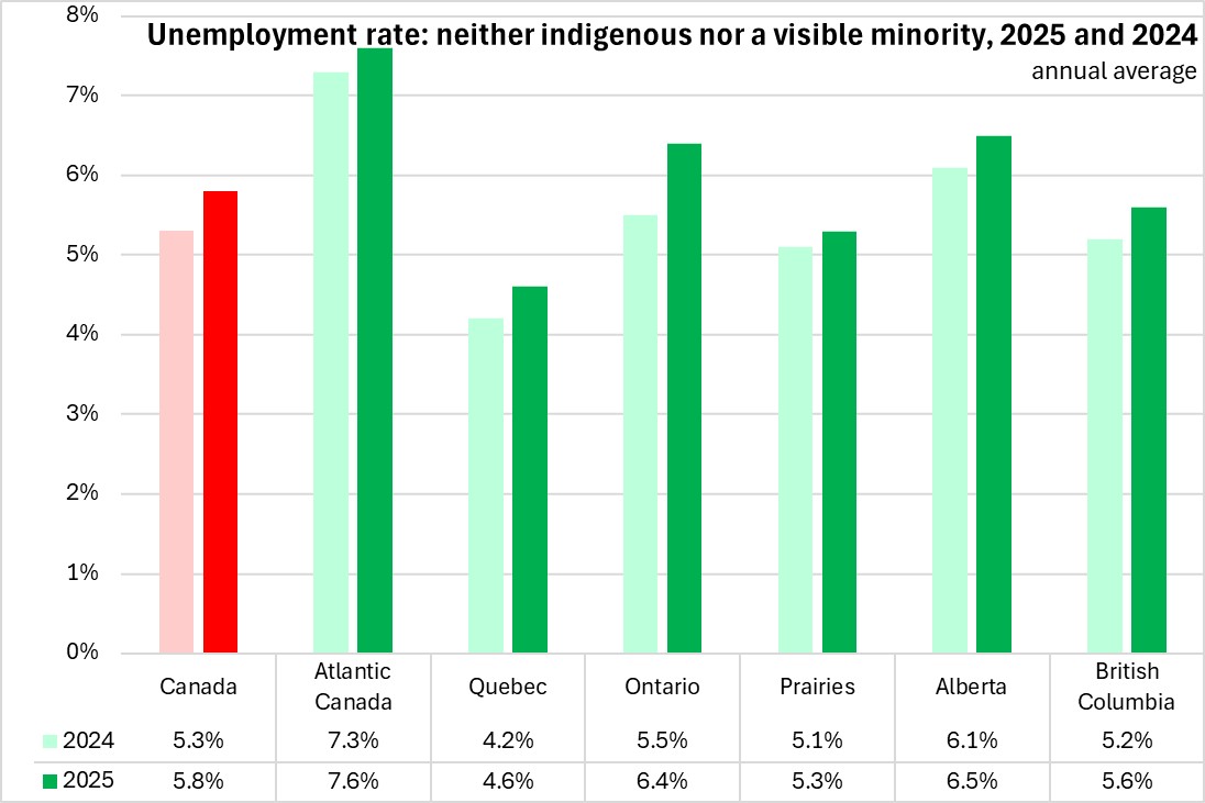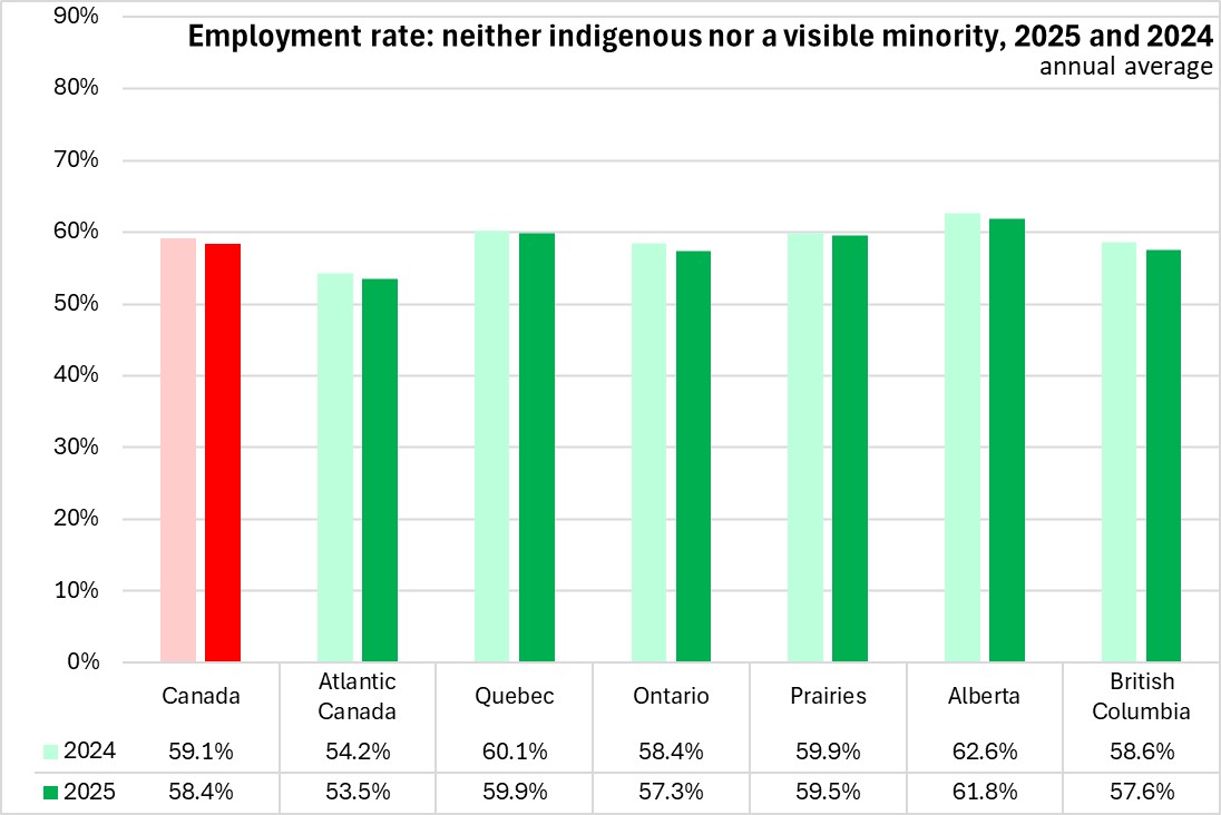 National employment rates for those that identified as neither Indigenous nor in a visible minority population declined to 58.4% in 2025. Employment rates for those that identified as neither Indigenous nor in a visible minority population were down in in all regions in 2025.