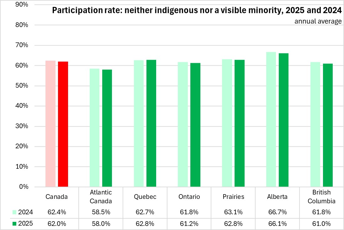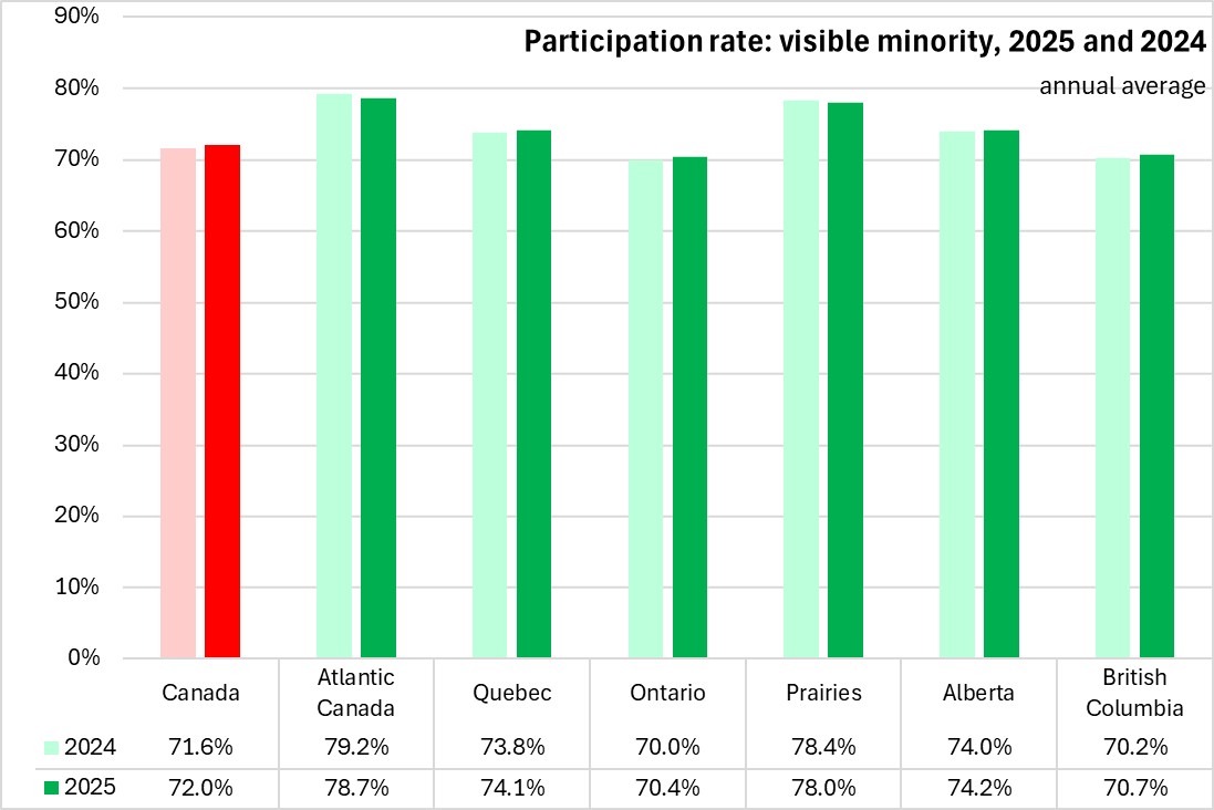 Participation rates for visible minority populations were up across Canada in 2025, reflecting increases in Quebec, Ontario, Alberta and British Columbia partially offset by declines in Atlantic Canada and the Prairies.