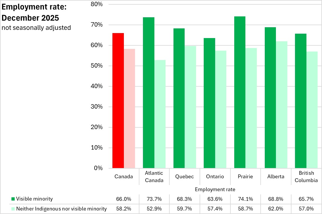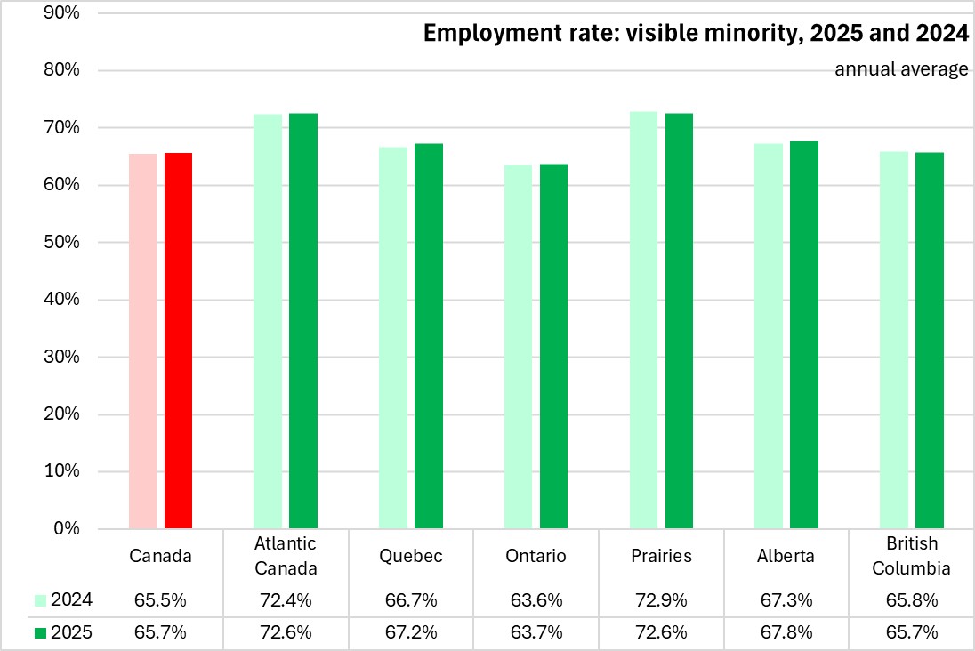 With rising participation rate (despite higher unemployment rate), Canada's employment rate for visible minority populations edged up to 65.7% in 2025. There were gains among all regions, except in the Prairies and British Columbia.