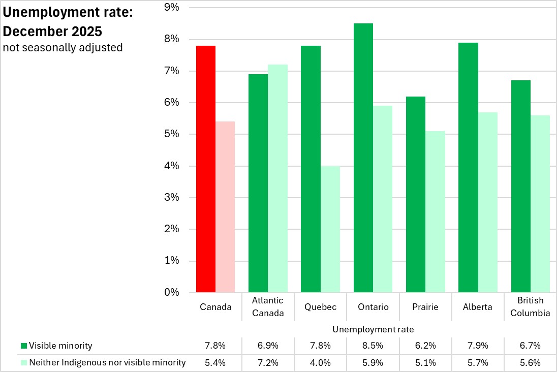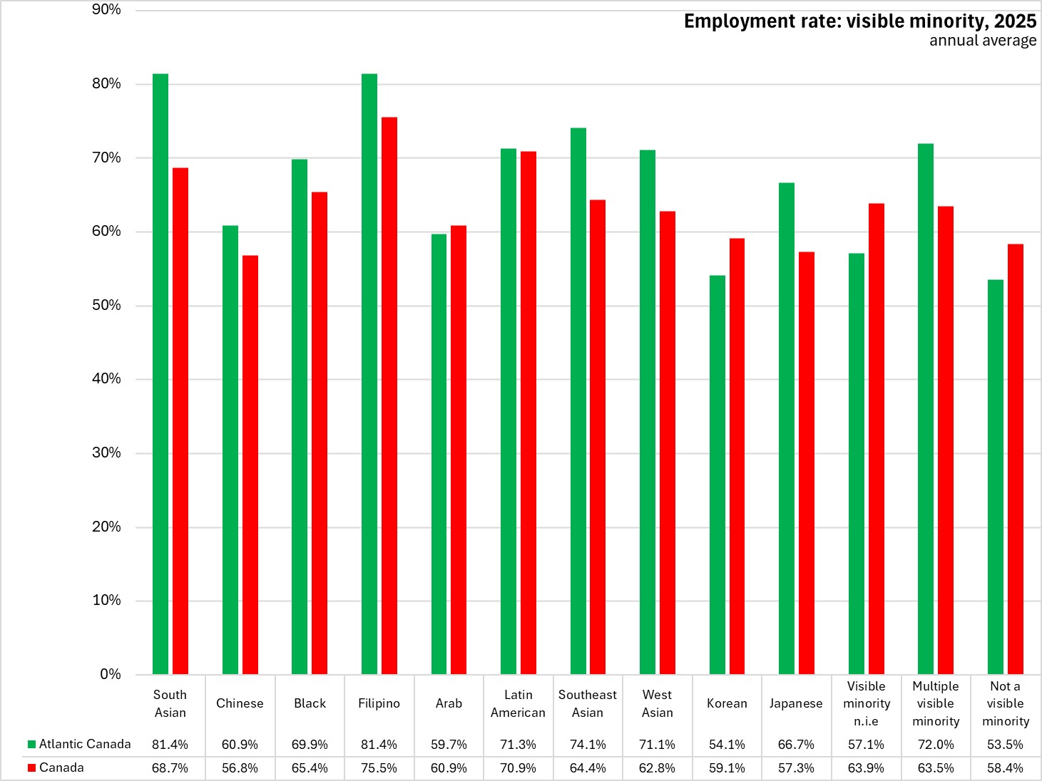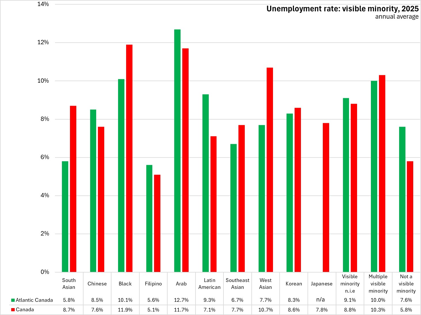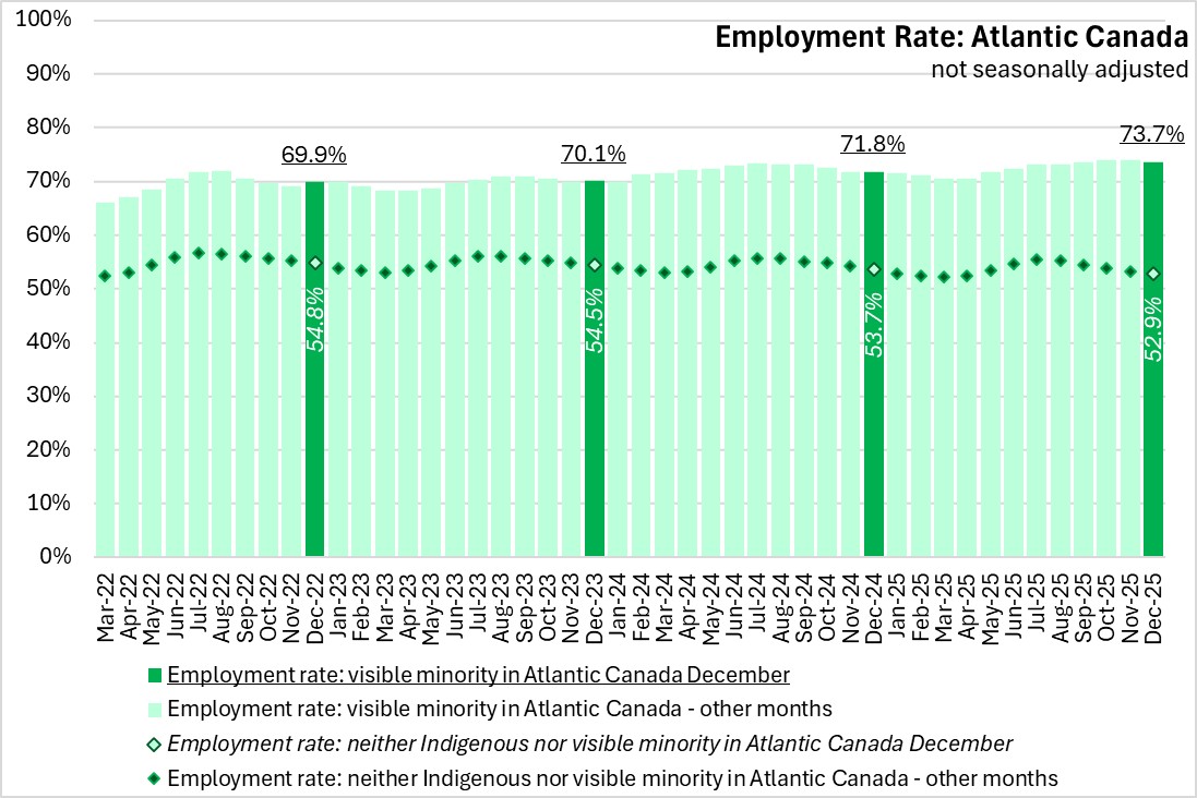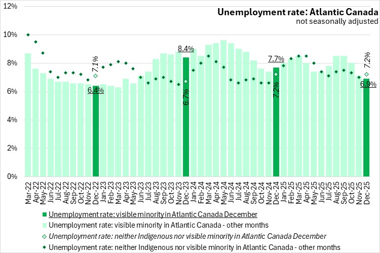 In December 2025, the unemployment rate for the visible minority population was lower compared to the population that was neither Indigenous nor in a visible minority population in Atlantic Canada.