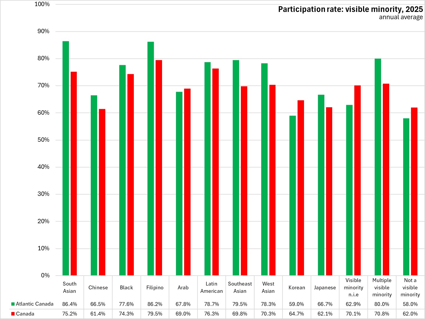 Participation rates for visible minority groups in Atlantic Canada in 2025 were higher than the national average for most visible minorities. Participation rates among Atlantic Canada's population that identified as Arab, Korean, other visible minorities as well as those not in a visible minority group had lower participation rates in 2025.