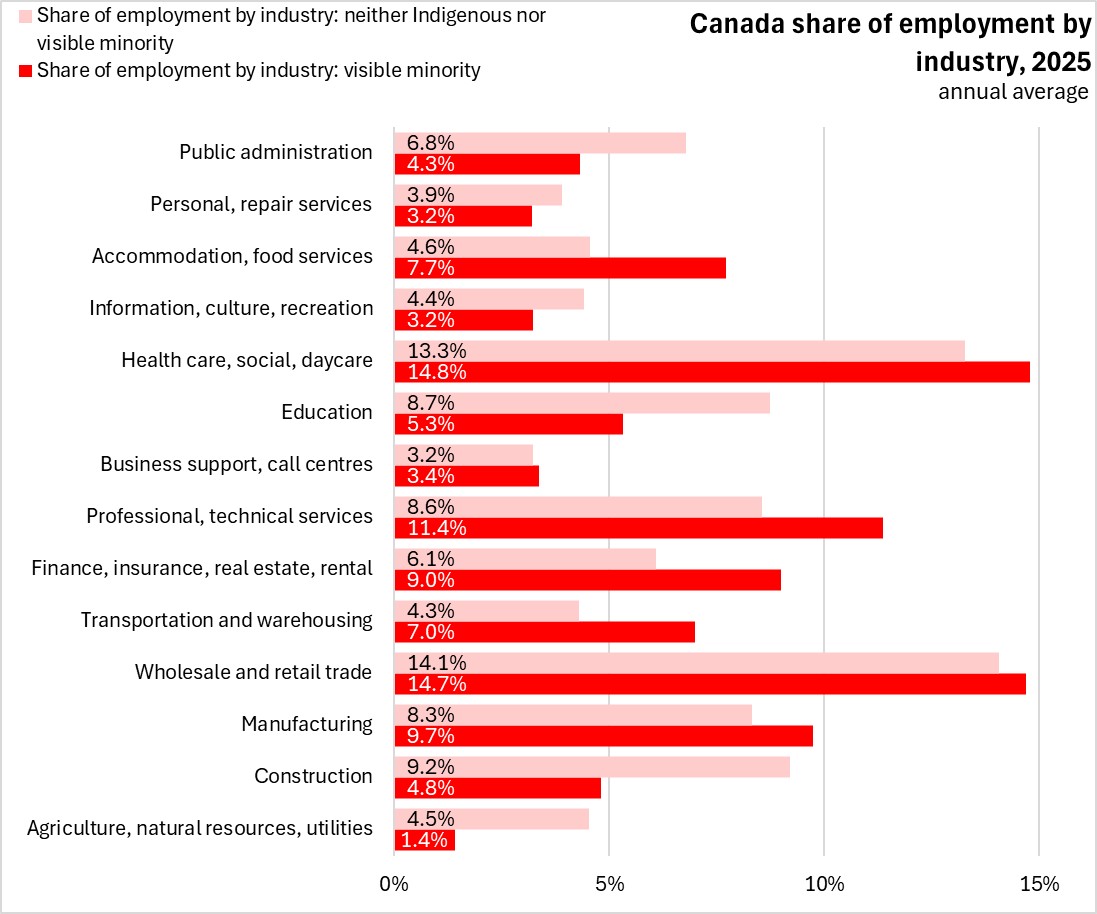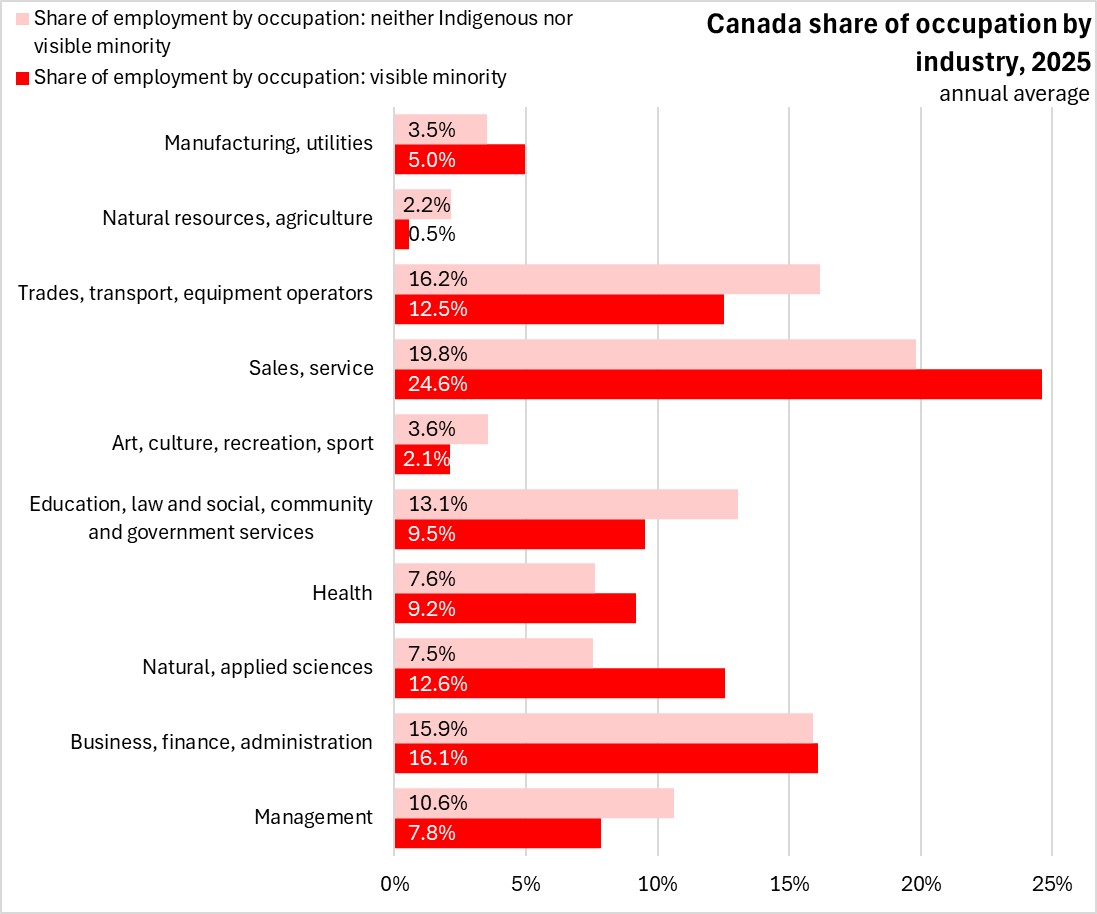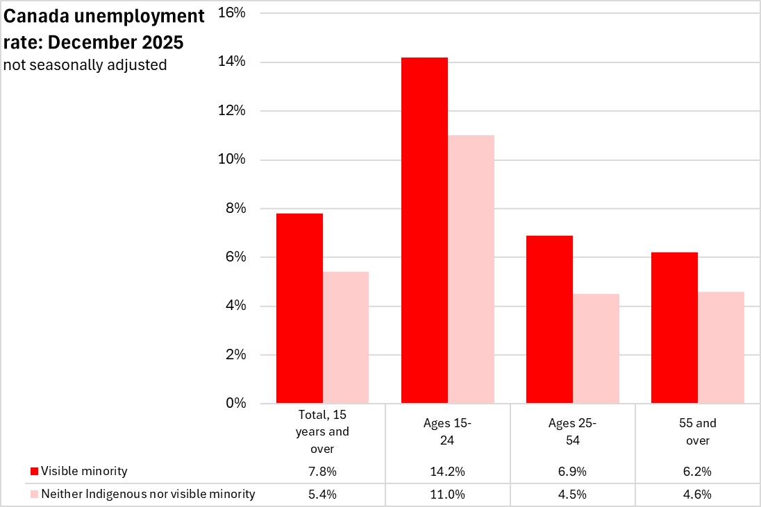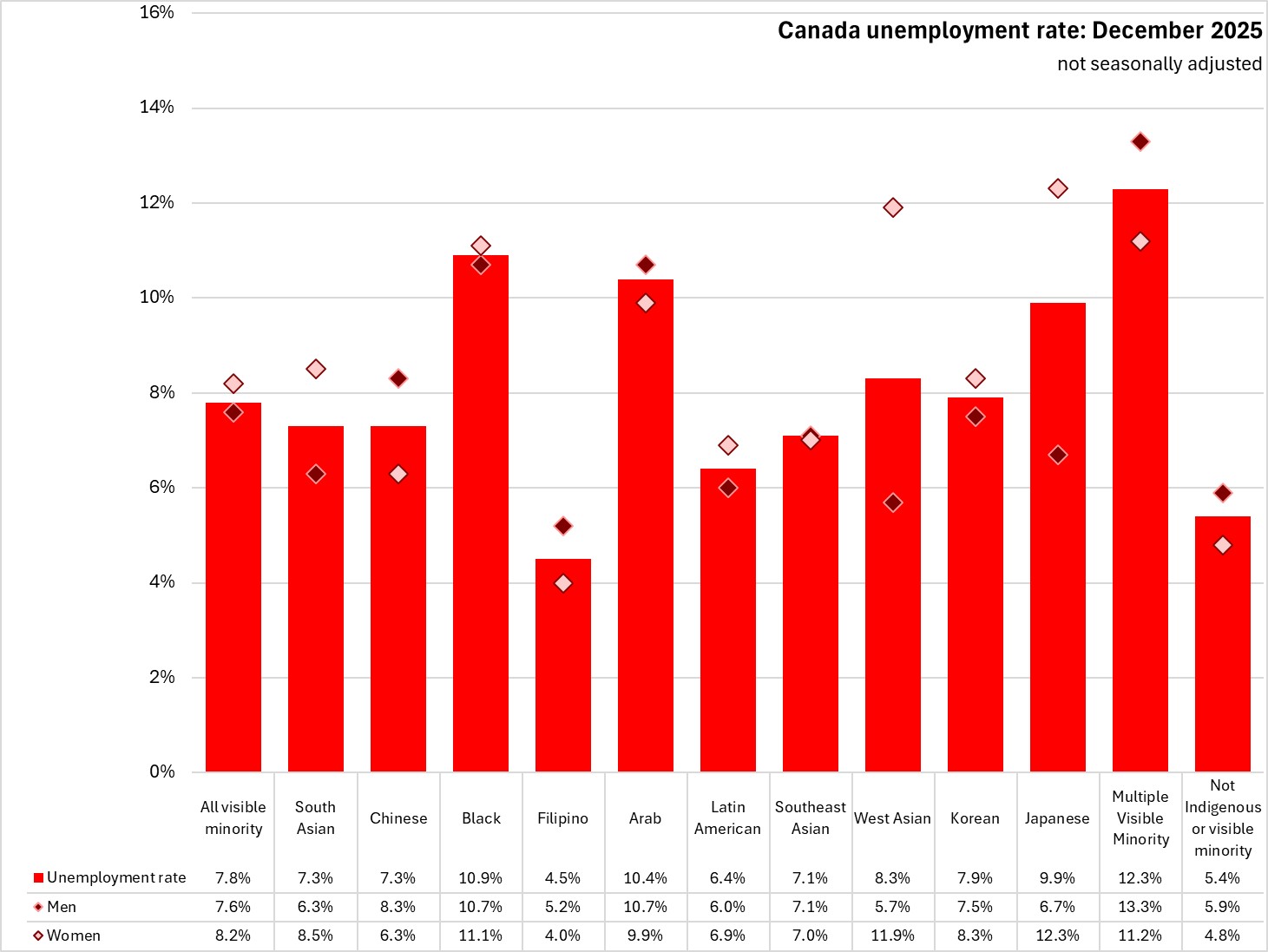 In December 2025, the unemployment rates of males in all visible minority populations were lower (7.6%) than for females in visible minority populations (8.2%), which was not the case for populations that did not identify as Indigenous or visible minorities. Among specific populations, female unemployment rates were lower than for males among Chinese, Filipino, Arab, and South East Asian, as well as for those that identified with multiple visible minority populations and those not indigenous or visible minority.