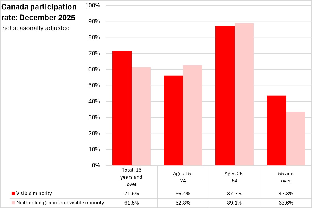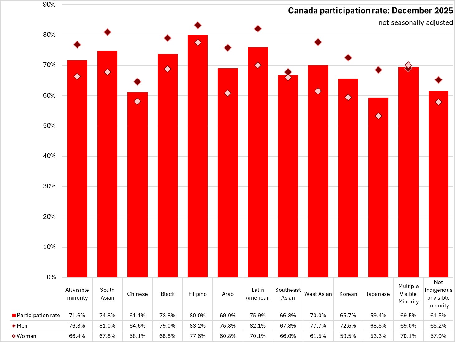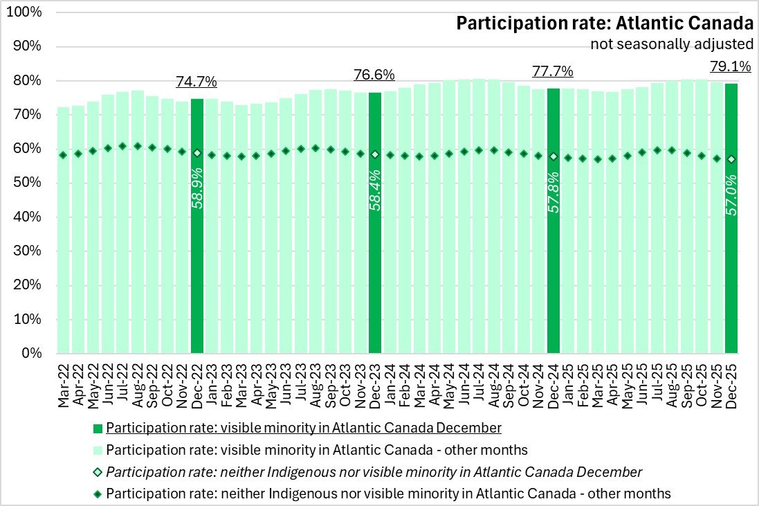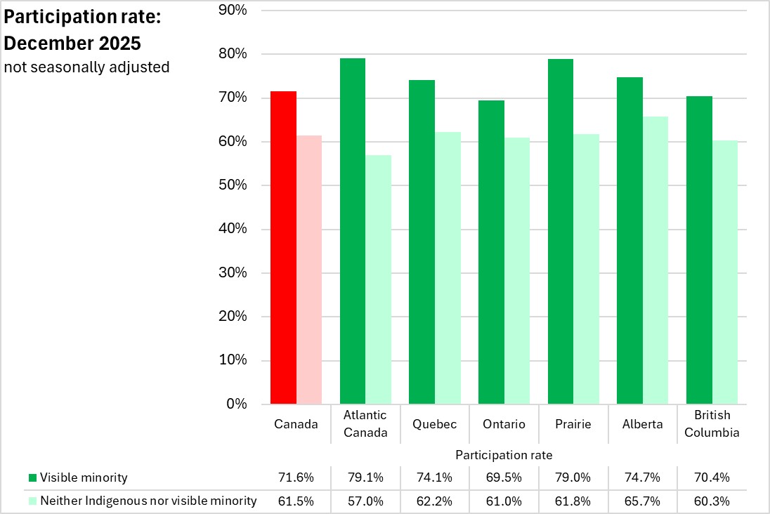 National participation rates were higher for those who identify with a visible minority population (71.6%) than for those that did not identify as Indigenous or in a visible minority population (61.5%). Participation rates of those who identify with a visible minority population were higher in all regions in December 2025. In Atlantic Canada, those who identify with a visible minority population reported a 79.1% participation rate, compared to a 57.0% participation rate for those that do not identify as Indigenous or in a visible minority population, the largest gap among regions.