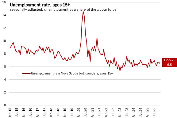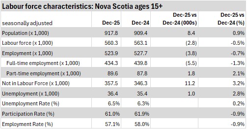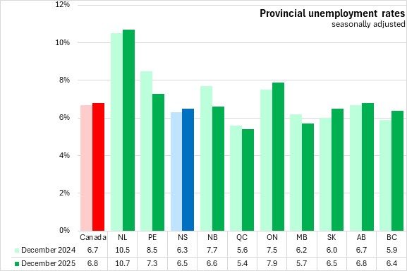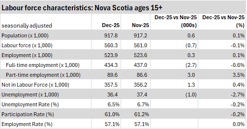 With employment rising on a smaller labour force, Nova Scotia's unemployment rate declined 0.2 percentage points to 6.5% in December 2025.