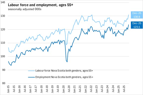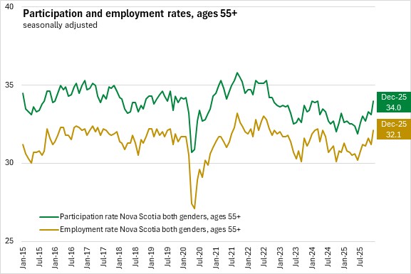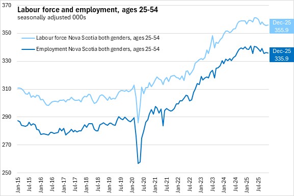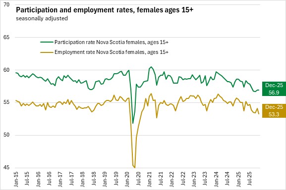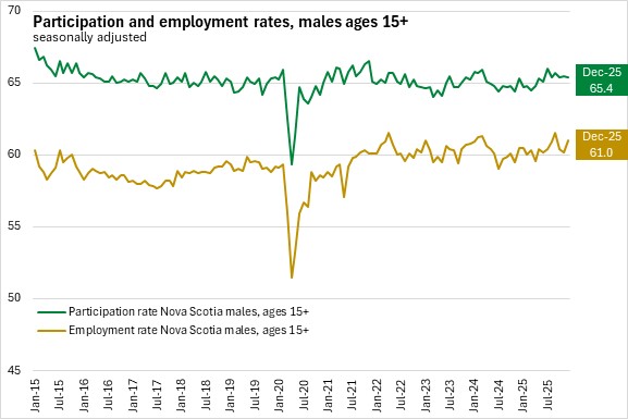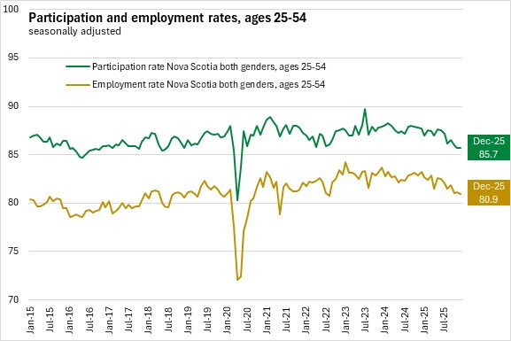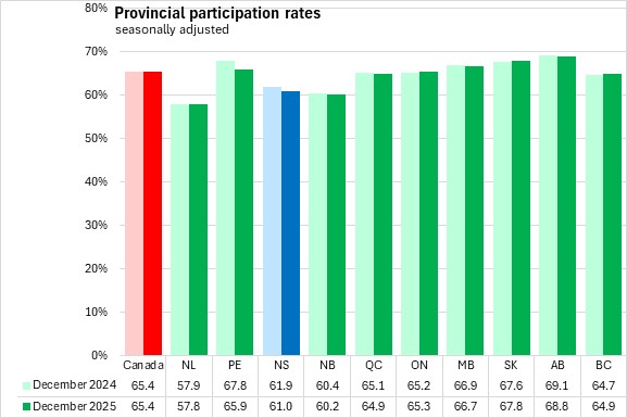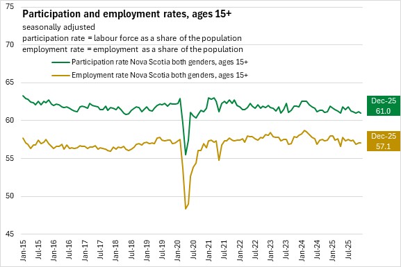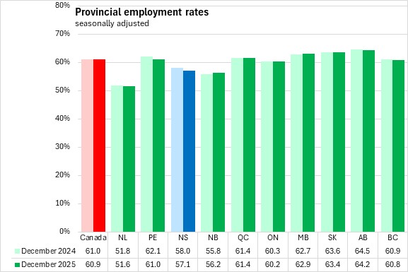Nova Scotia's labour force participation rate declined 0.2 percentage points to 61.0% while the employment rate was unchanged at 57.1% in December 2025.