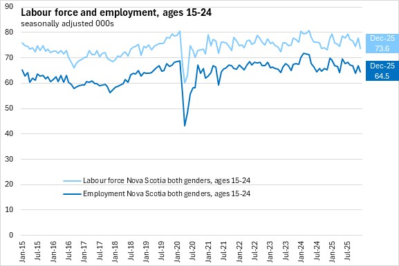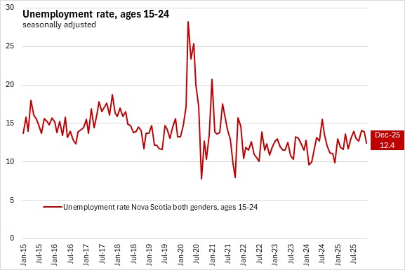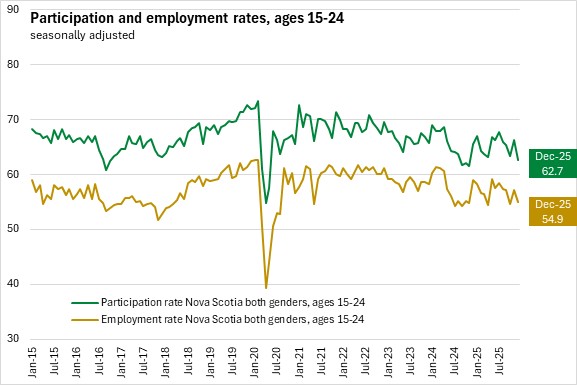 Among youth (ages 15-24), employment declined by 2,500 (-3.7%), outpaced by labour force decline of 4,200 (-5.4%). The youth unemployment rate fell 1.5 percentage points to 12.4% in December 2025. The youth participation rate decreased 3.6 percentage points to 62.7% while the youth employment rate decreased 2.2 percentage points to 54.9%.