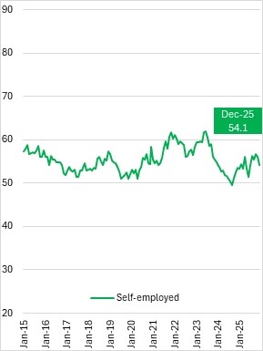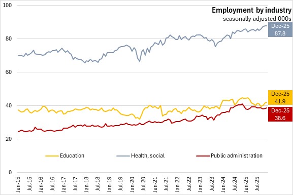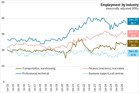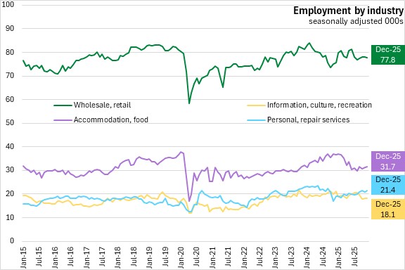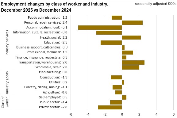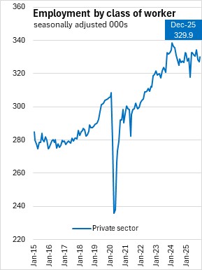 Compared to December 2024, employment declined for private sector workers (-2,800, -0.8%), and public sector (-1,400, -1.0%), partially offset by higher self-employment (+500, +0.9%).