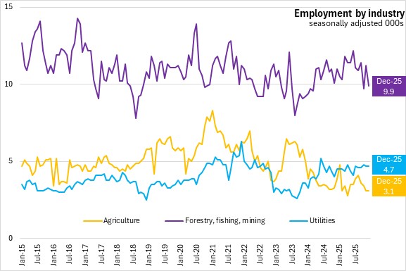 The population aged 25-54 makes up the largest part of the labour force. In the core age group, employment declined by 500 (-0.1%) while the labour force rose by 400 (+0.1%). With employment falling and the labour force rising, the core aged unemployment rate rose 0.2 percentage point to 5.6% in December 2025. The core aged participation rate was unchanged at 85.7%, while the core aged employment rate was down 0.2 percentage point to 80.9%.