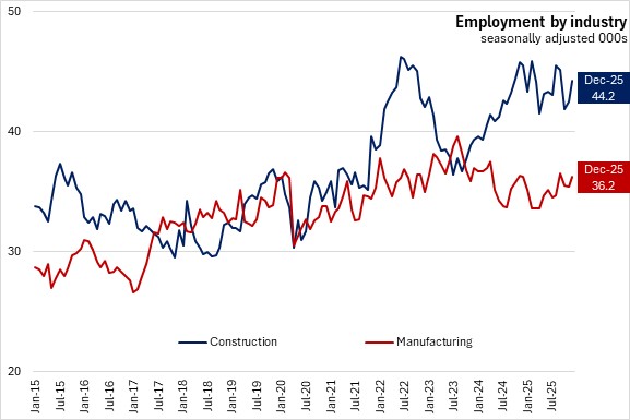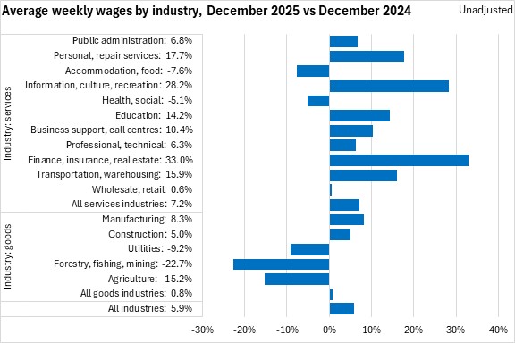 Average weekly earnings increased by 5.9% from December 2024 to December 2025. The fastest gains in average weekly earnings were in finance/insurance/real estate, information/culture/recreation, and personal/repair services. The largest declines in average weekly wages were in forestry/fishing/mining, followed by agriculture.