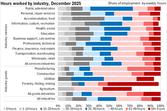 Compared to the provincial average, a larger share of workers in goods producing industries (except utilities), transportation/warehousing, business support/call centres, and personal/repair services worked more than 40 hours per week in December 2025.