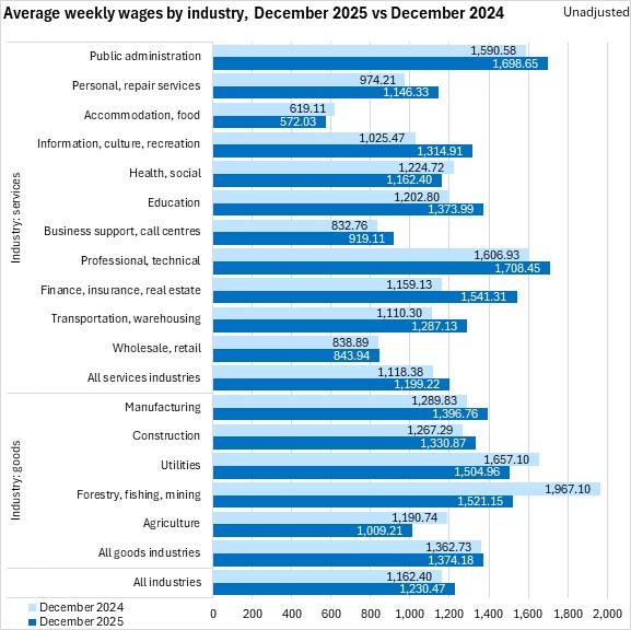 Average weekly earnings across all employees were $1,230.47 in December 2025. The highest average weekly earnings (both full and part time employees) were reported in professional/technical services, public administration, and finance/insurance/real estate. The lowest average weekly earnings were in accommodation/food services, wholesale/retail trade, and business support/call centres.