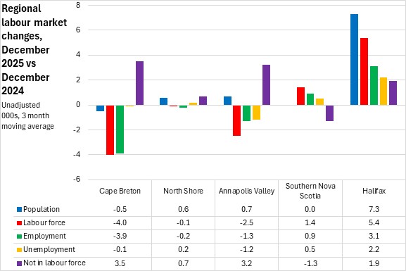 Compared with December 2024, labour force and employment growth was reported in Halifax and Southern Nova Scotia. Southern Nova Scotia reported labour force growth with no population growth, drawing from those not in the labour force. Halifax reported population and labour force gains that outpaced employment, resulting in a rise in both the unemployed and those not in the labour force. Cape Breton and Annapolis Valley reported labour force declines that outpaced employment declines, with fewer unemployed but notable rises in those not in the labour force. North Shore reported the smallest declines in labour force and employment, with population growth largely translating into those not in the labour force.