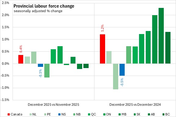 Canada's labour force rose 0.4% from November with five provinces reporting growth in December 2025. The fastest growth was in Ontario, while the fastest decline was in New Brunswick.