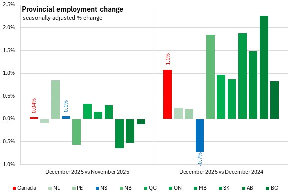 Compared with December 2024, the national employment gain was 1.1% with all provinces reporting growth except Nova Scotia. The fastest growth was in Alberta.