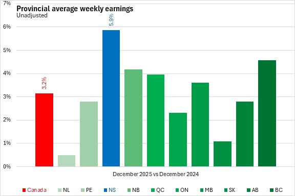 In unadjusted results, Nova Scotia's average weekly earnings grew by 5.9% year-over-year, the fastest gain among provinces. National average weekly earnings were up 3.2% with the slowest growth in Newfoundland and Labrador and Saskatchewan.