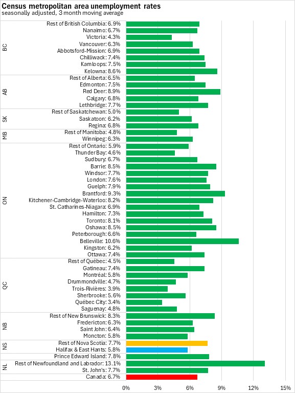 The Halifax & East Hants unemployment rate was 5.8% in the seasonally adjusted December 2025 three month moving average. Outside of Halifax & East Hants the unemployment rate was 7.7%. In central and western provinces, unemployment rates in Census Metropolitan Areas are similar to or higher than unemployment rates outside of CMAs. In the Atlantic Provinces unemployment rates are typically higher outside of CMAs.