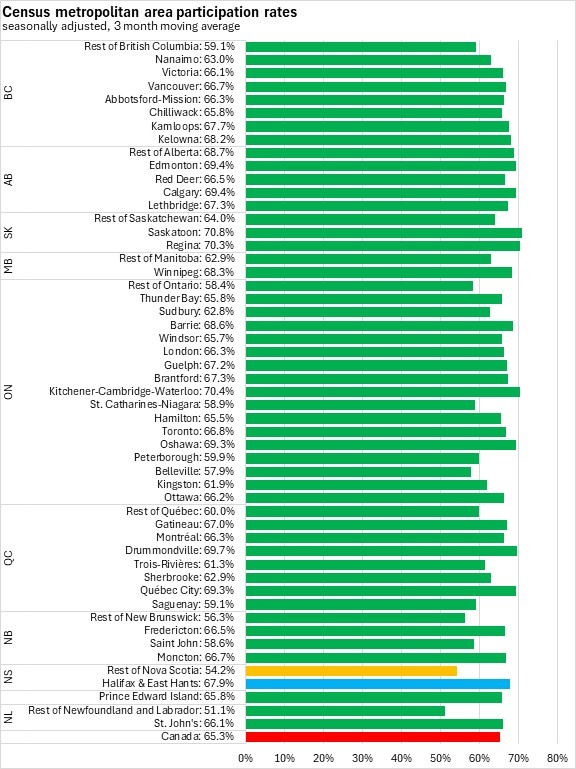 Halifax & East Hant's participation rate was 67.9% in the seasonally adjusted December 2025 three month moving average, while participation rates were 54.2% across the rest of the province.