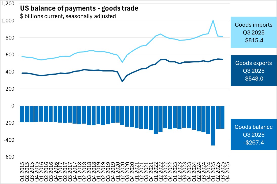 In Q3 2025, US goods exports declined by $1.9 billion to $548.0 billion, while US goods imports decreased by $5.0 billion to $815.4 billion, resulting in a deficit of $267.4 billion.