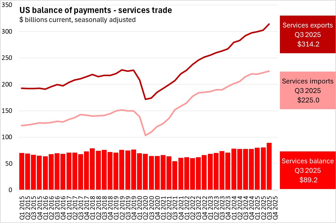 In Q3 2025, US services exports increased $11.7 billion to $314.2 billion, while services imports increased $3.1 billion to $225.0 billion.