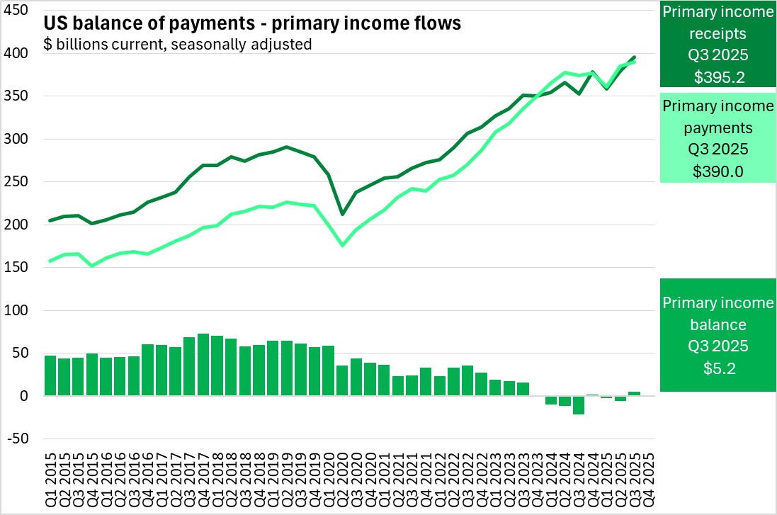 In Q3 2025, US primary income payments increased $5.3 billion to $390.0 billion, while primary income receipts increased $16.3 billion to $395.2 billion.