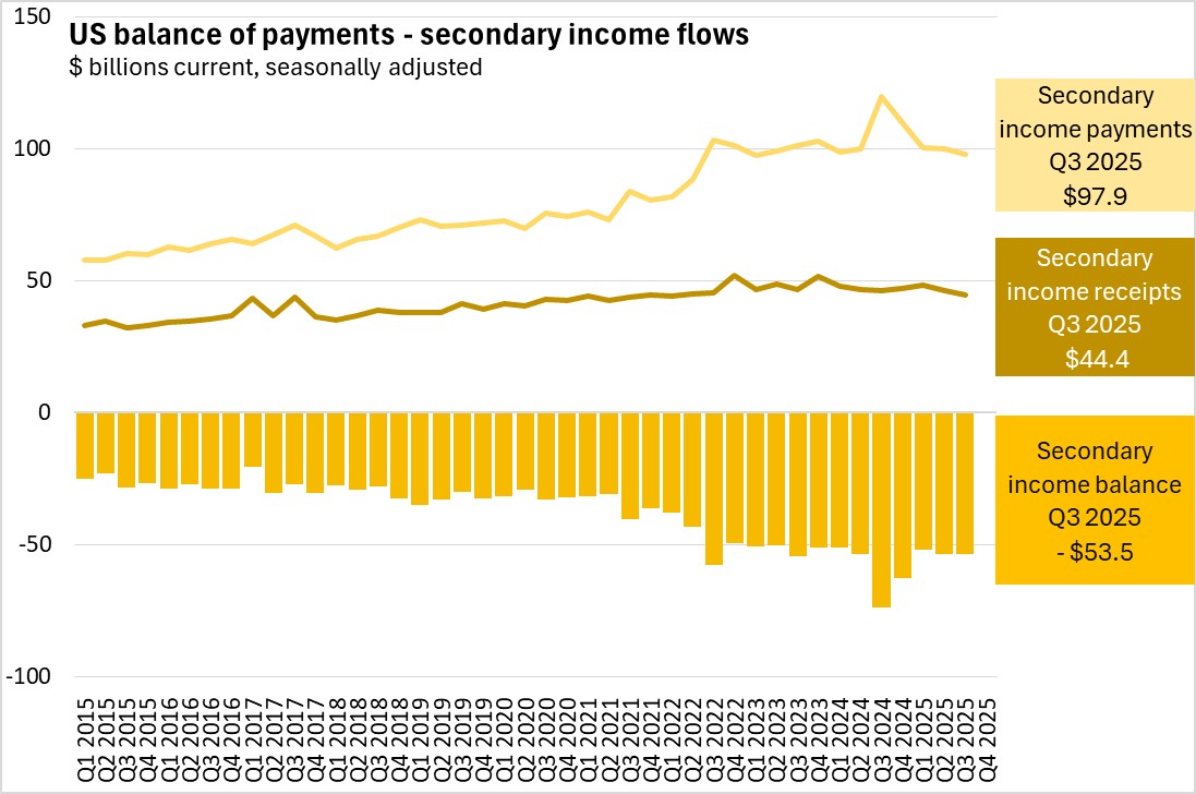 In Q3 2025, US secondary income receipts decreased $2.0 billion to $44.4 billion while US secondary income payments decreased $2.1 billion to $97.9 billion.