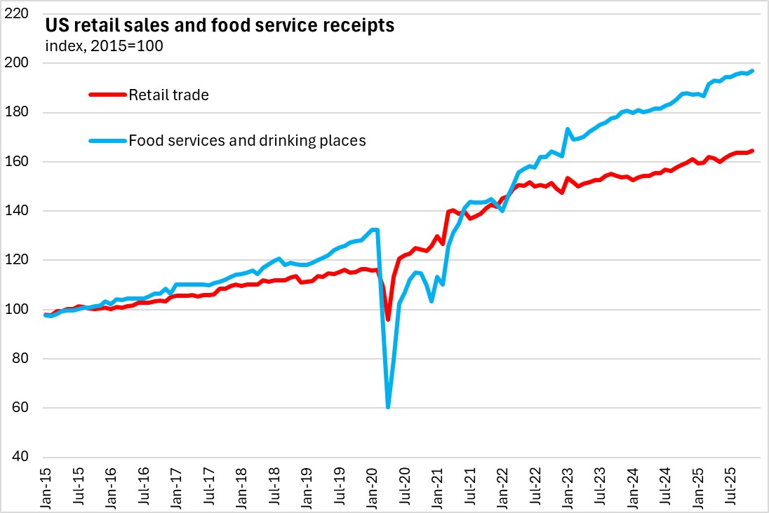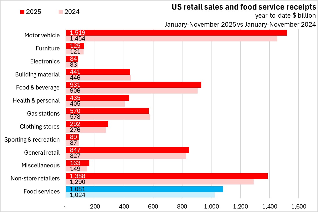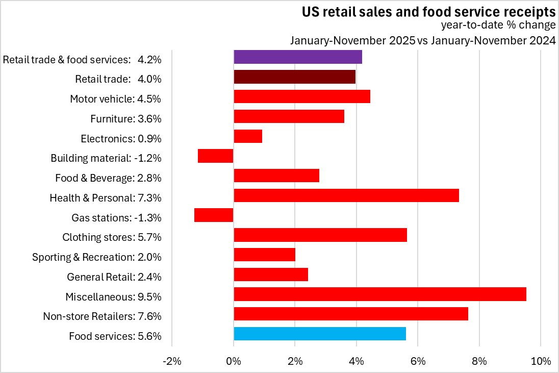 In the first eleven months of 2025, retail trade and food services receipts were up 4.2% compared to the same period last year. US retail sales were up 4.0% with gains in all categories except in building material and gas stations. The fastest gains (in percentage terms) were in miscellaneous, non-store retailers and health/personal care. Food service receipts were up 5.6% year-to-date.