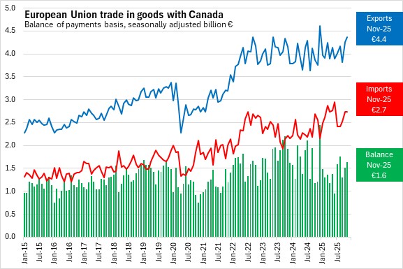 - The European Union's surplus in goods trade with Canada widened by €128.8 million to €1.6 billion.