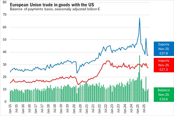 - The European Union's surplus in goods trade with the US widened by €1.2 billion to €10.6 billion.