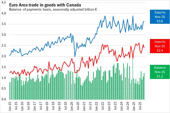 - the Euro Area surplus in goods trade with Canada widened by €161.3 million to €1.2 billion.