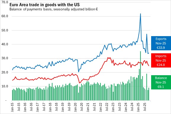 - the Euro Area surplus in goods trade with the US widened by €1.5 billion to €9.1 billion.
