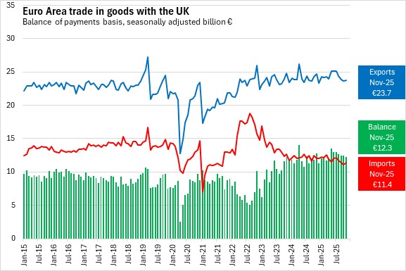 - the Euro Area surplus in goods trade with the UK narrowed by €230.2 million to €12.3 billion.
