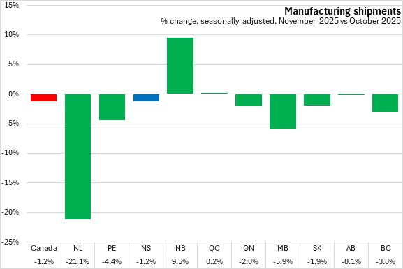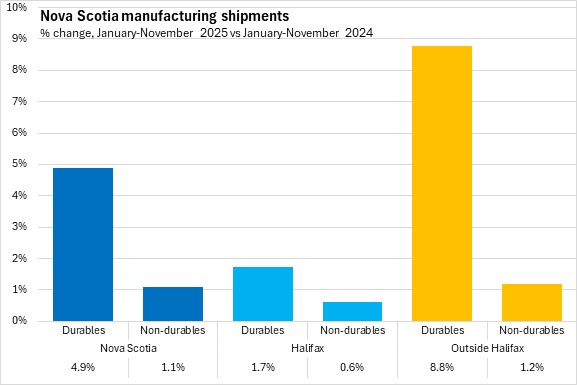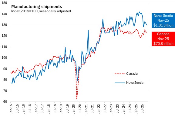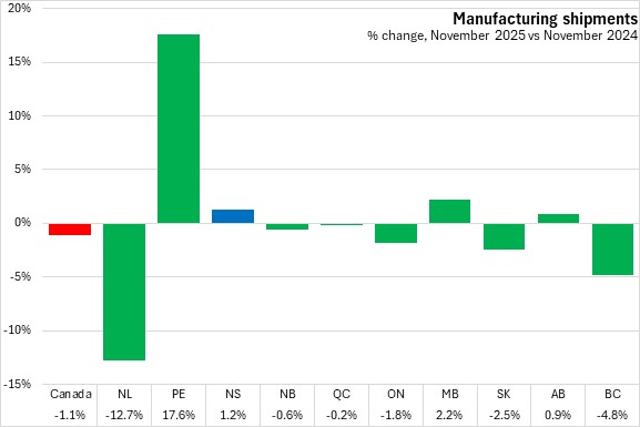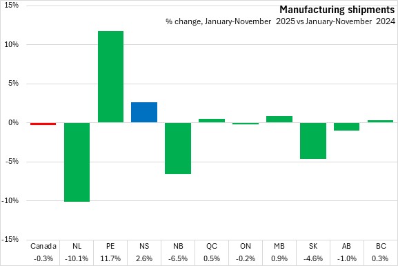 Nova Scotia's manufacturing shipments increased by 2.6% in January-November, compared to the same period in 2024. National shipments decreased 0.3%. Five provinces reported increases, led by Prince Edward Island (followed by Nova Scotia). Newfoundland and Labrador reported the steepest decline.
