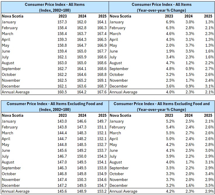 Nova Scotia’s all items Consumer Price Index (CPI) grew 3.1% year-over-year in December 2025, up 0.7 percentage points from the previous month.