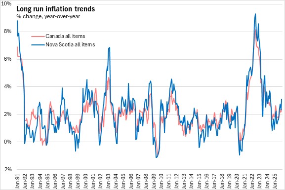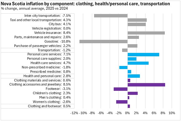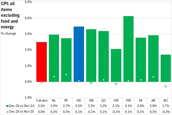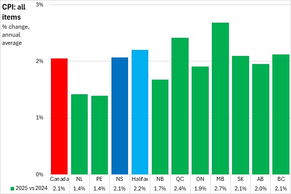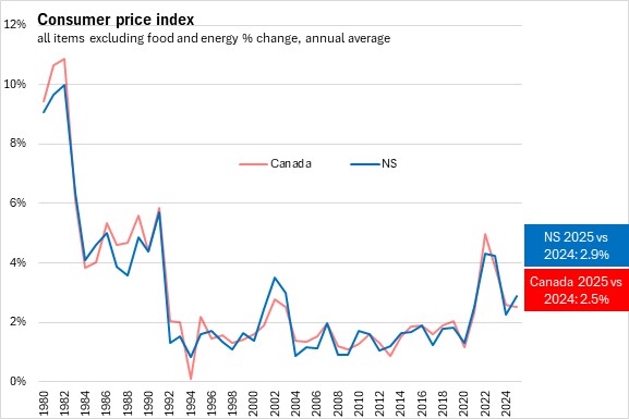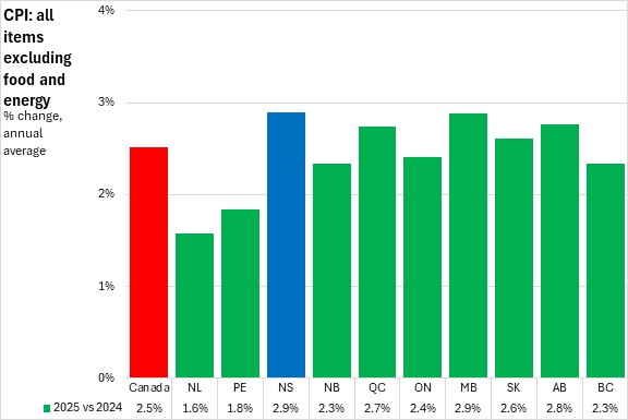 Nova Scotia's all items CPI excluding food and energy prices averaged 2.9% inflation in 2025, above the national average of 2.5%. All provinces reported higher prices with the fastest gains in Nova Scotia and Manitoba, and the slowest in Newfoundland and Labrador.