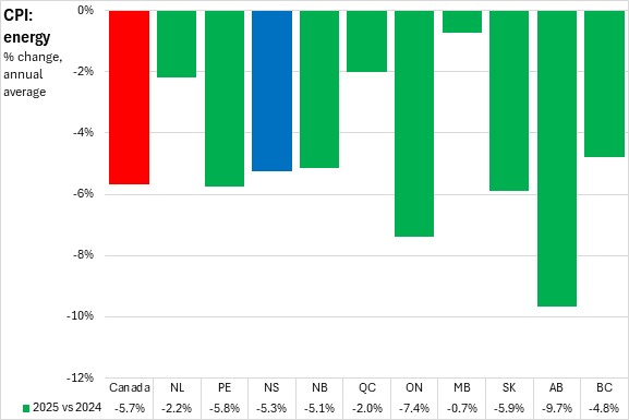 Nova Scotia's energy prices decreased 5.3% in 2025, slower than the national decline of 5.7%. All provinces reported declining energy prices in 2025, with the fastest decline in Alberta, and the slowest decrease in Manitoba.