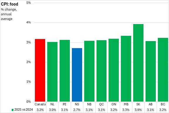 Nova Scotia's food price inflation averaged 2.7% in 2025, slowest among provinces. All provinces reported rising food prices in 2025 with the fastest increase in Saskatchewan with the national average at 3.2%.