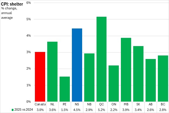 Nova Scotia's shelter prices averaged 4.5% inflation in 2025, faster than the national increase of 3.0%. All provinces reported higher shelter prices for the year with the fastest gain in Québec and slowest gain in Prince Edward Island.