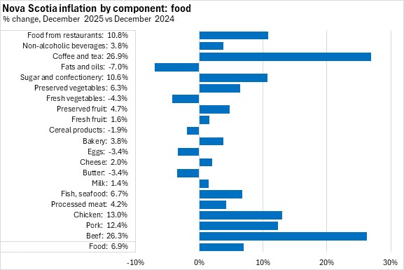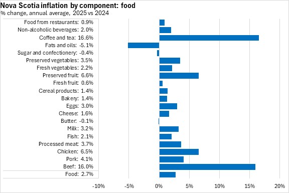 Among detailed food products with available data, Nova Scotia's average inflation in 2025 was fastest for coffee/tea and beef. The only price declines were reported in fats/oils, sugar/confectionary, and butter.
