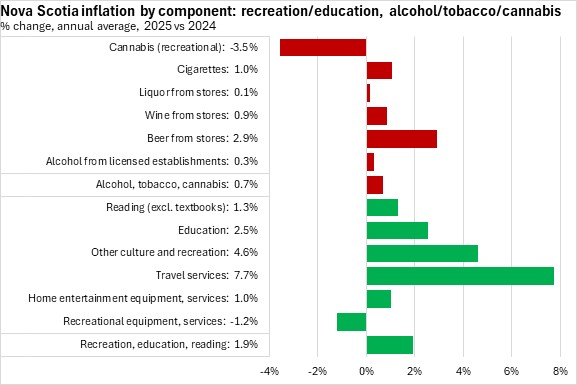 Nova Scotia's overall prices for recreation, education and reading were up 1.9% on average in 2025. The fastest price increases were in travel services, while recreational equipment/services reported the only drop in prices.