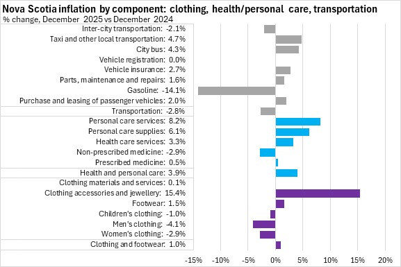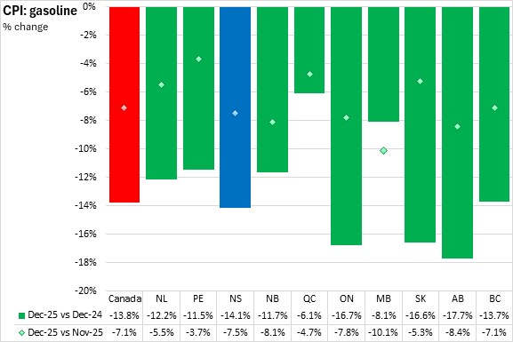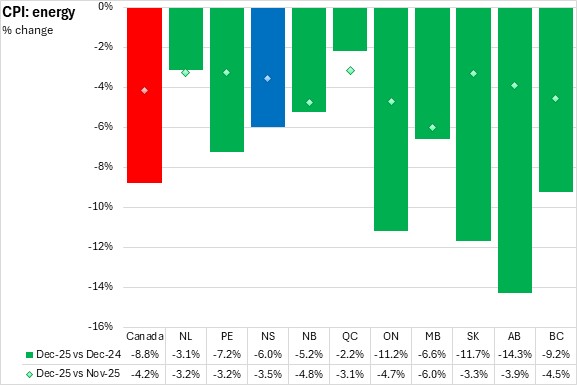 On a monthly basis, Nova Scotia's all items CPI was down 0.2% from November 2025 to December 2025. National prices were also down 0.2% on average. There were price decreases reported in eight provinces (led by British Columbia) and unchanged in two provinces (Newfoundland and Labrador and Québec).