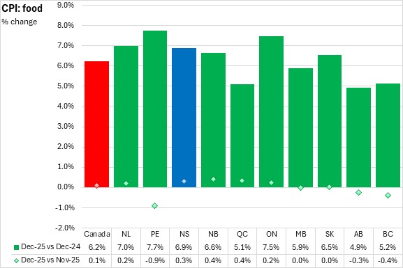 Food prices increased 6.9% in Nova Scotia year-over-year, above national average food price inflation of 6.2% in December 2025. Food prices were up in every province, led by Prince Edward Island.