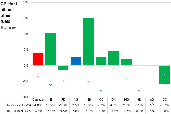 Nova Scotia's year-over-year fuel oil prices were up 2.5% in December 2025 compared with December 2024. Nationally, the fuel oil and other fuels price index increased 4.0% compared to December 2024, with seven provinces reporting increases. New Brunswick reported the largest increase in fuel oil prices while British Columbia and Prince Edward Island reported the only declines.