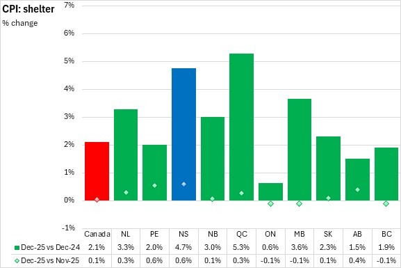 Year-over-year shelter cost inflation was 4.7% in Nova Scotia in December 2025, the second fastest increase among provinces. National shelter prices were up 2.1% with increases in all provinces. Québec had the largest increase in shelter prices, while Ontario reported the slowest increase.