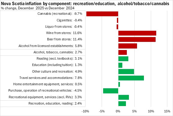 Nova Scotia's prices for alcohol, tobacco and recreational cannabis were up 2.7% year-over-year, with an increase in prices for beer and wine from stores and alcohol from licensed establishments partially offset by declines in all other categories, led by recreational cannabis.