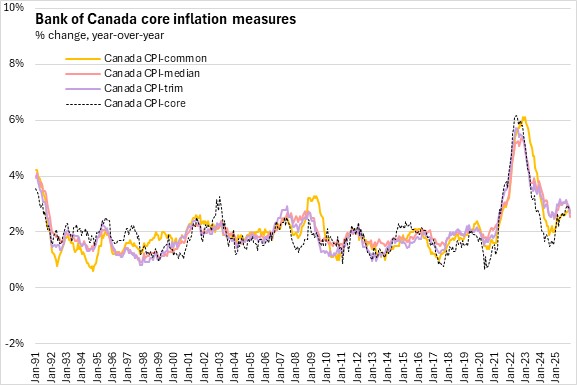 The Bank of Canada's year-over-year core inflation measures in December 2025 were: