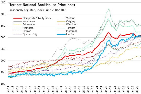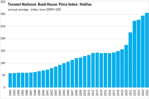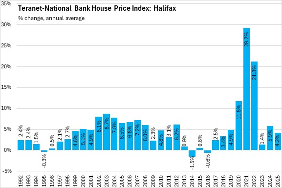 Looking at annual averages of the Teranet-National Bank House Price Index for Halifax, growth has slowed in 2025 after accelerating in 2024.