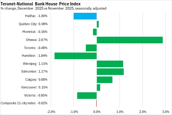 Halifax resale home prices, as measured by the Teranet-National Bank House Price Index (seasonally adjusted), dropped 1.0% from November to December.